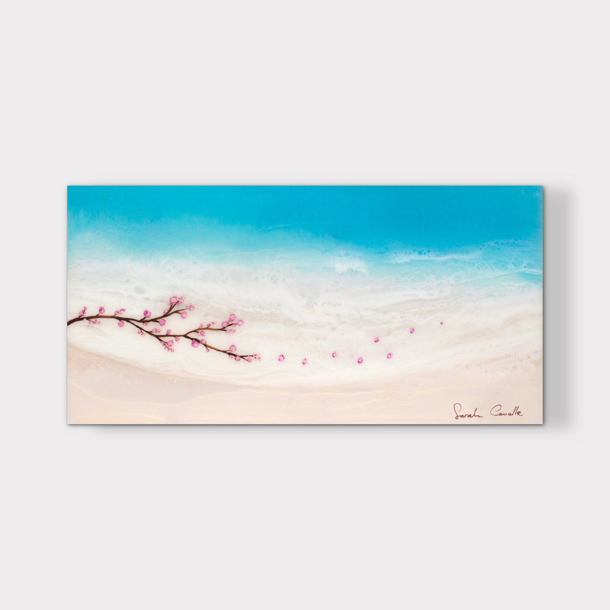 The original painting was professionally scanned and color-matched, then produced on premium photo paper and mounted behind glossy 4 mm acrylic glass—the gallery standard. This finish gives the artwork vivid depth and a modern look that closely resembles the resin in Sarah’s original paintings. An aluminum Dibond backing ensures stability, and each piece arrives ready to hang.