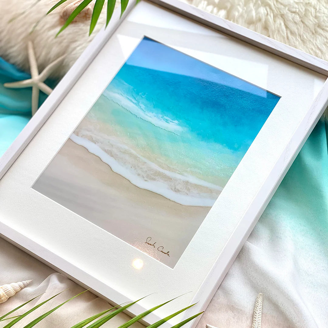 This matted print is reproduction on an original painting created with layered acrylic and resin on wood. Inspired by Hawaii’s beaches, Sarah captured the ocean’s beauty through vibrant colors, flowing movement, and organic forms, building each layer to mirror the sea’s rhythm. She no longer paints with resin after closing her Kaka'ako studio in 2021, making these works a special part of her earlier works.