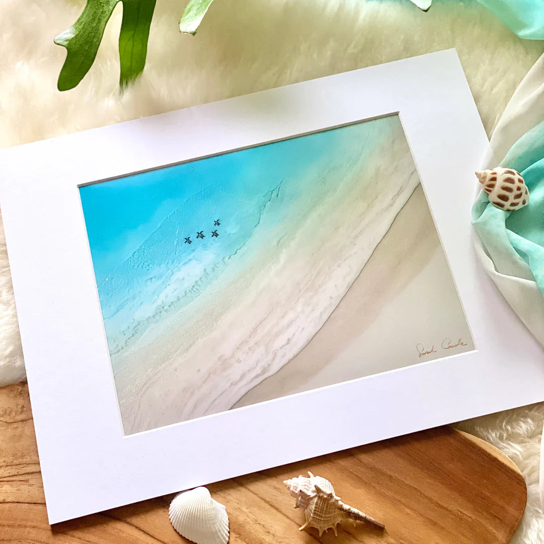 This matted print is reproduction on an original painting created with layered acrylic and resin on wood. Inspired by Hawaii’s beaches, Sarah captured the ocean’s beauty through vibrant colors, flowing movement, and organic forms, building each layer to mirror the sea’s rhythm. She no longer paints with resin after closing her Kaka'ako studio in 2021, making these works a special part of her earlier works.