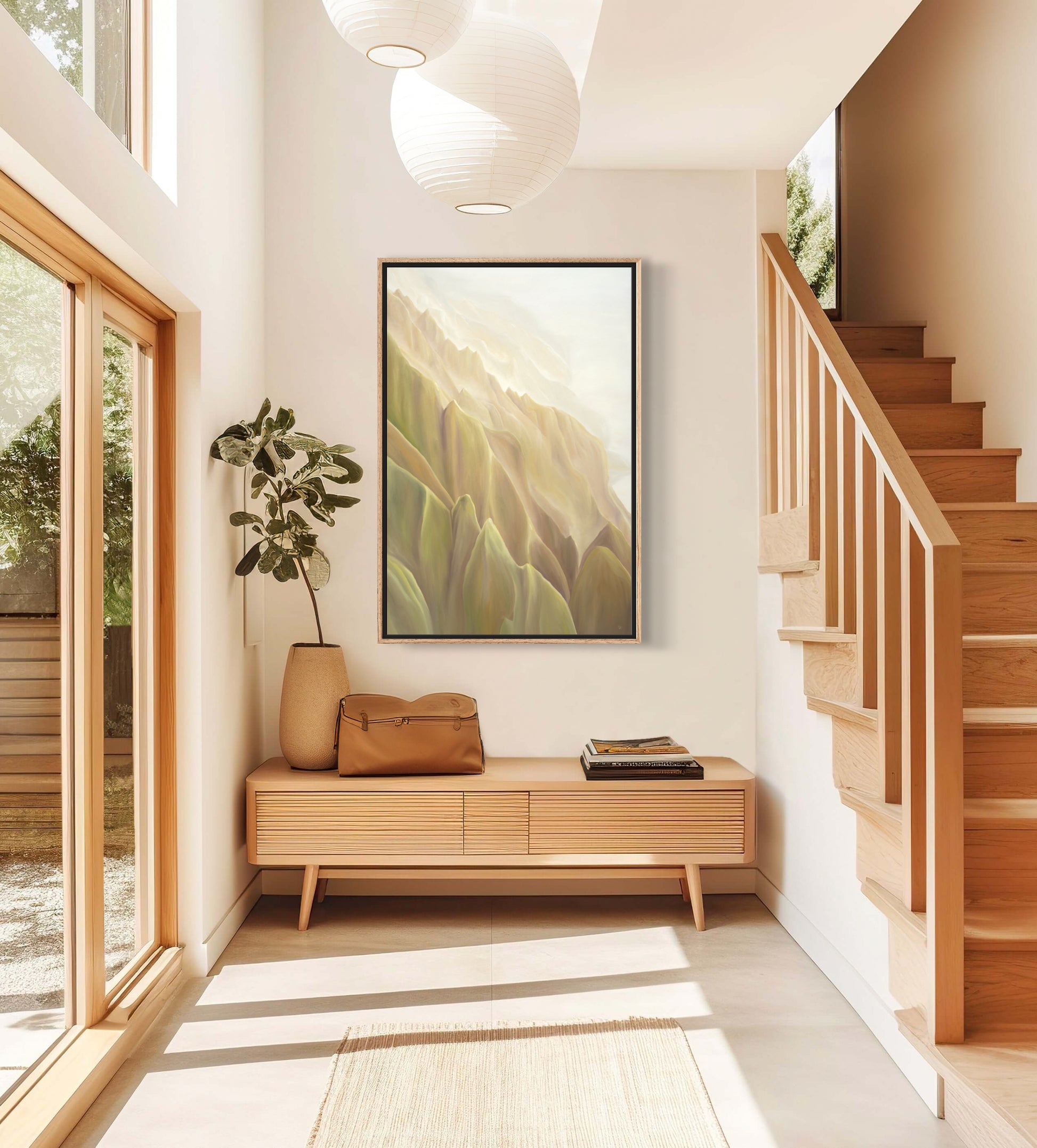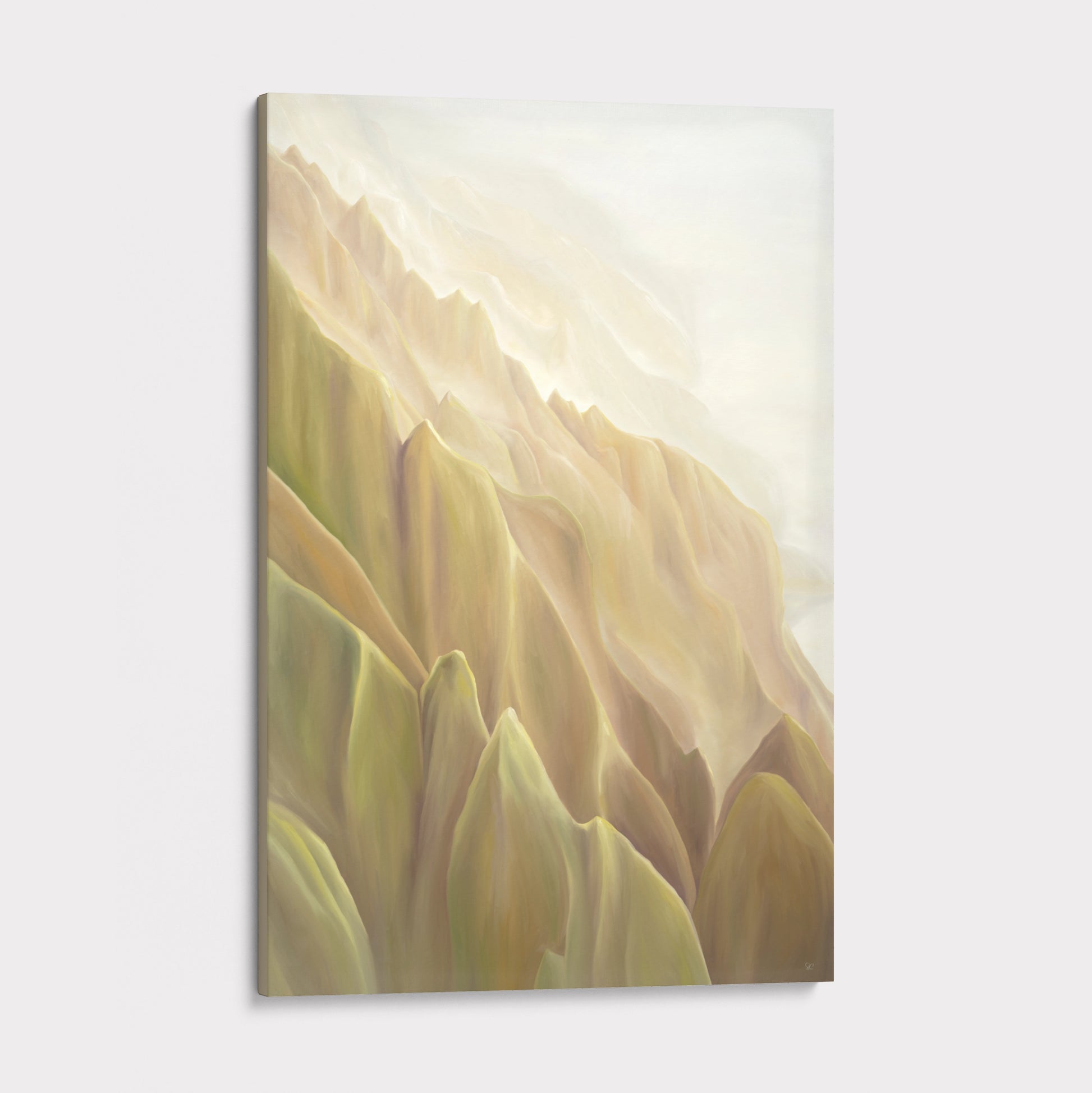 This is a reproduction of an original 48" x 72" painting created with oil on canvas. Using sculptural lines and neutral colors, her new work reflects the simple, yet complex beauty of nature, conveys elegance and sophistication, and evokes a sense of peace and wonder.