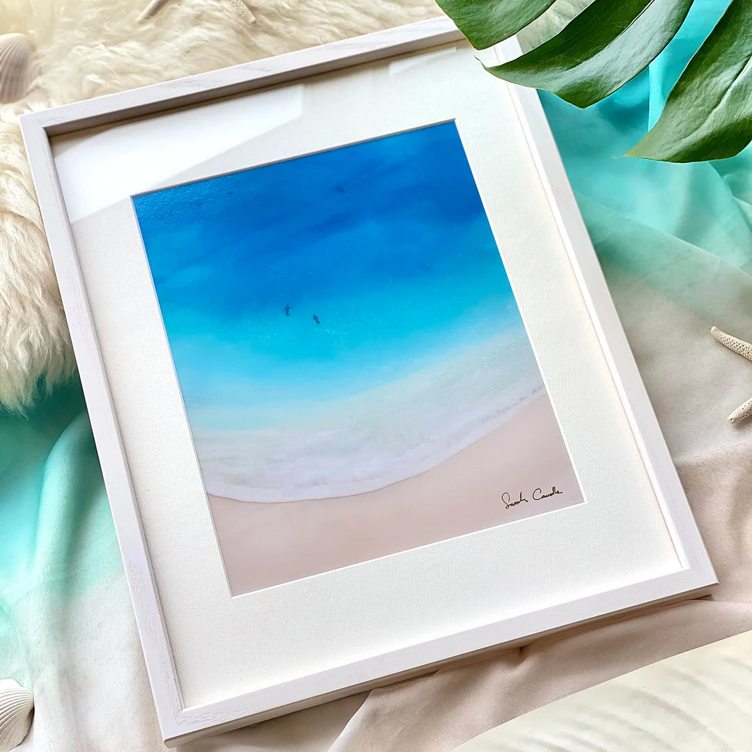 This matted print is reproduction on an original painting created with layered acrylic and resin on wood. Inspired by Hawaii’s beaches, Sarah captured the ocean’s beauty through vibrant colors, flowing movement, and organic forms, building each layer to mirror the sea’s rhythm. She no longer paints with resin after closing her Kaka'ako studio in 2021, making these works a special part of her earlier works.