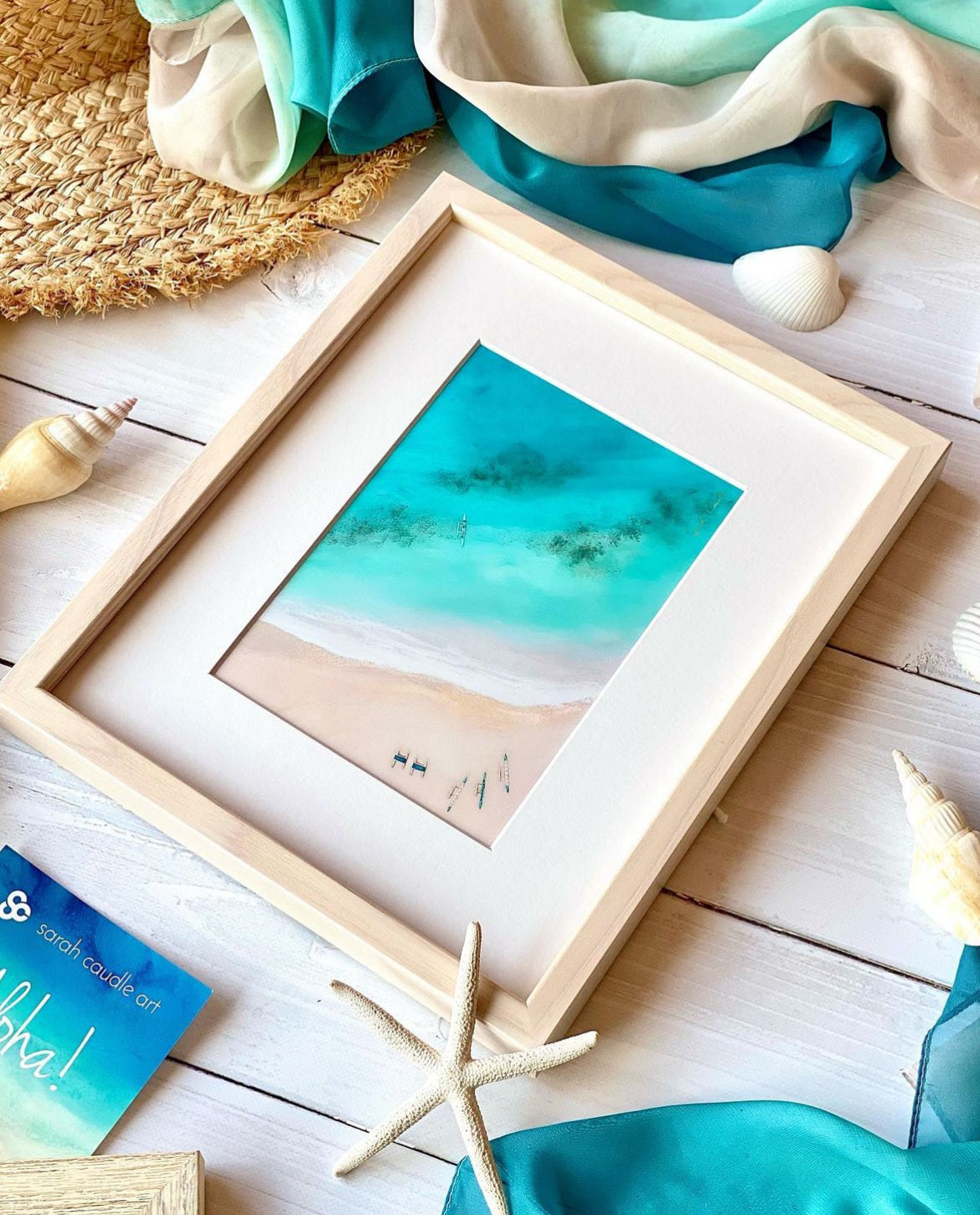 This matted print is reproduction on an original painting created with layered acrylic and resin on wood. Inspired by Hawaii’s beaches, Sarah captured the ocean’s beauty through vibrant colors, flowing movement, and organic forms, building each layer to mirror the sea’s rhythm. She no longer paints with resin after closing her Kaka'ako studio in 2021, making these works a special part of her earlier works.