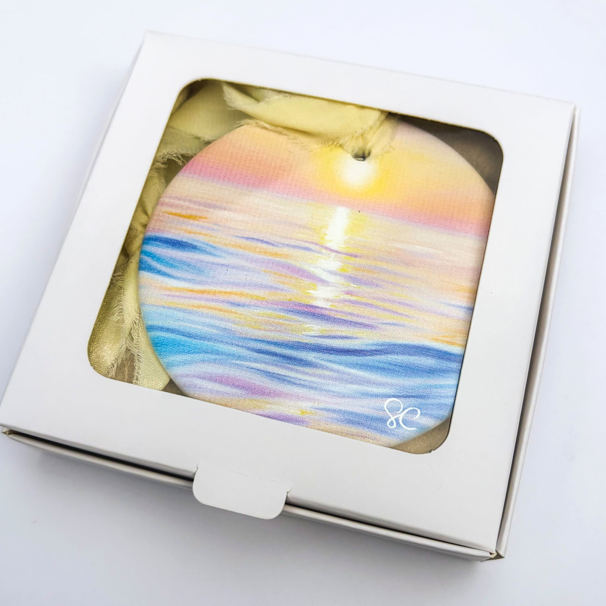 The 2025 ornaments feature six of Sarah’s most popular prints from this past year, beautifully reproduced with a matte finish on a 3" round ceramic ornament. Each piece is adorned with a satin chiffon handmade ribbon* and individually signed and dated in gold by Sarah on the back.