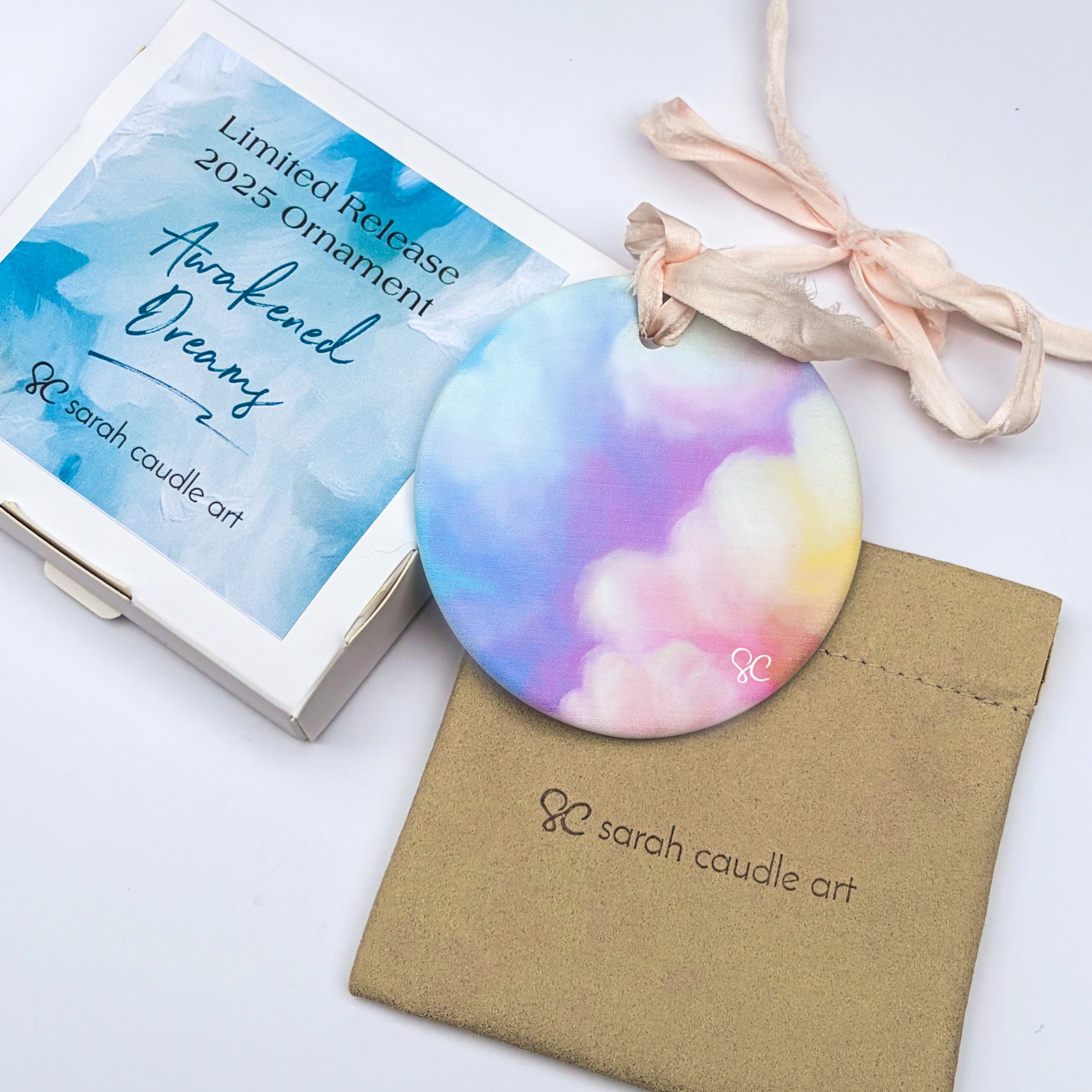 The 2025 ornaments feature six of Sarah’s most popular prints from this past year, beautifully reproduced with a matte finish on a 3" round ceramic ornament. Each piece is adorned with a satin chiffon handmade ribbon* and individually signed and dated in gold by Sarah on the back.