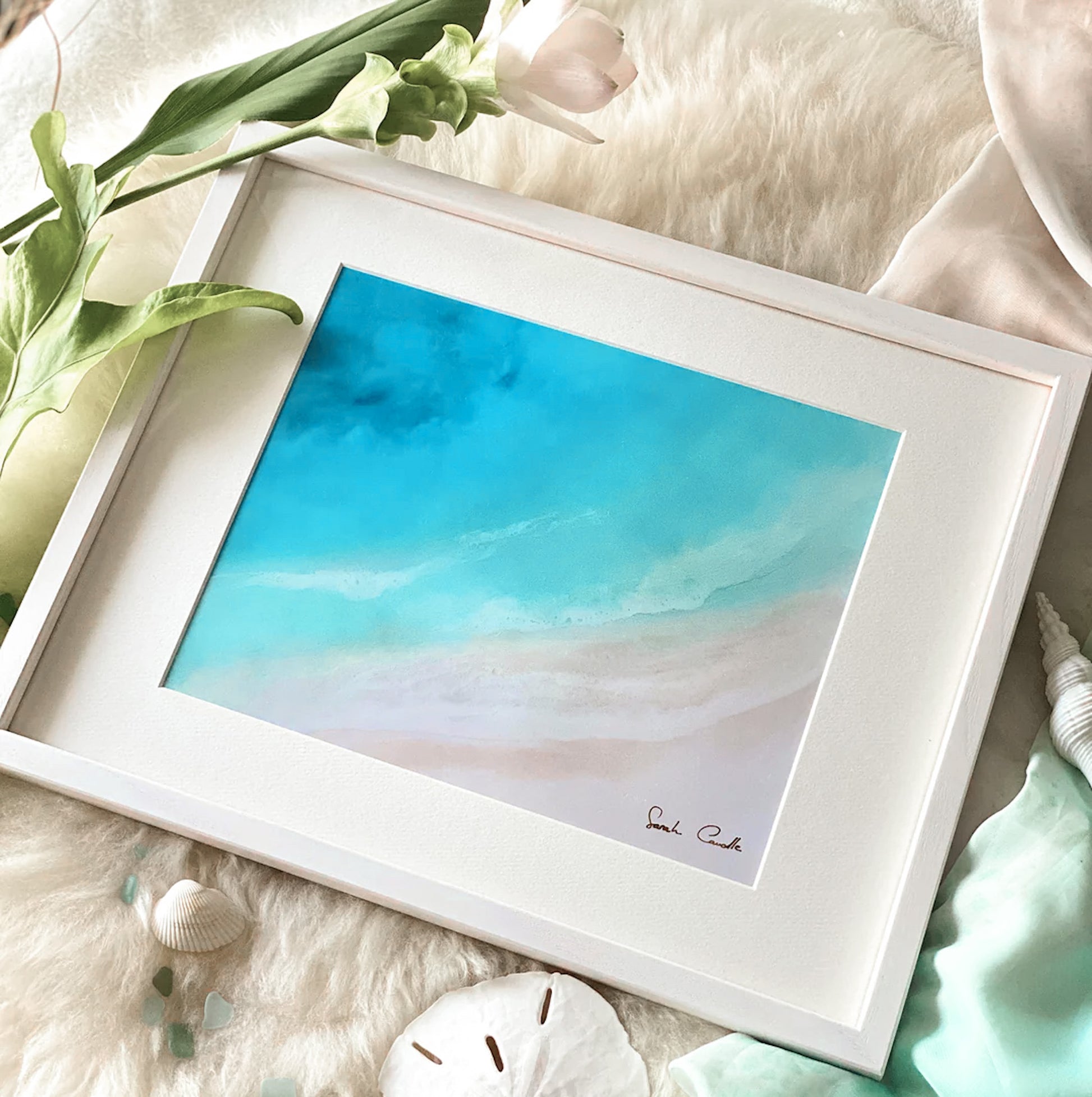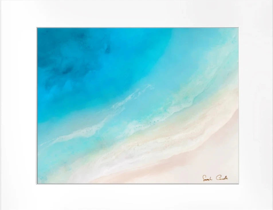 This matted print is reproduction on an original painting created with layered acrylic and resin on wood. Inspired by Hawaii’s beaches, Sarah captured the ocean’s beauty through vibrant colors, flowing movement, and organic forms, building each layer to mirror the sea’s rhythm. She no longer paints with resin after closing her Kaka'ako studio in 2021, making these works a special part of her earlier works.