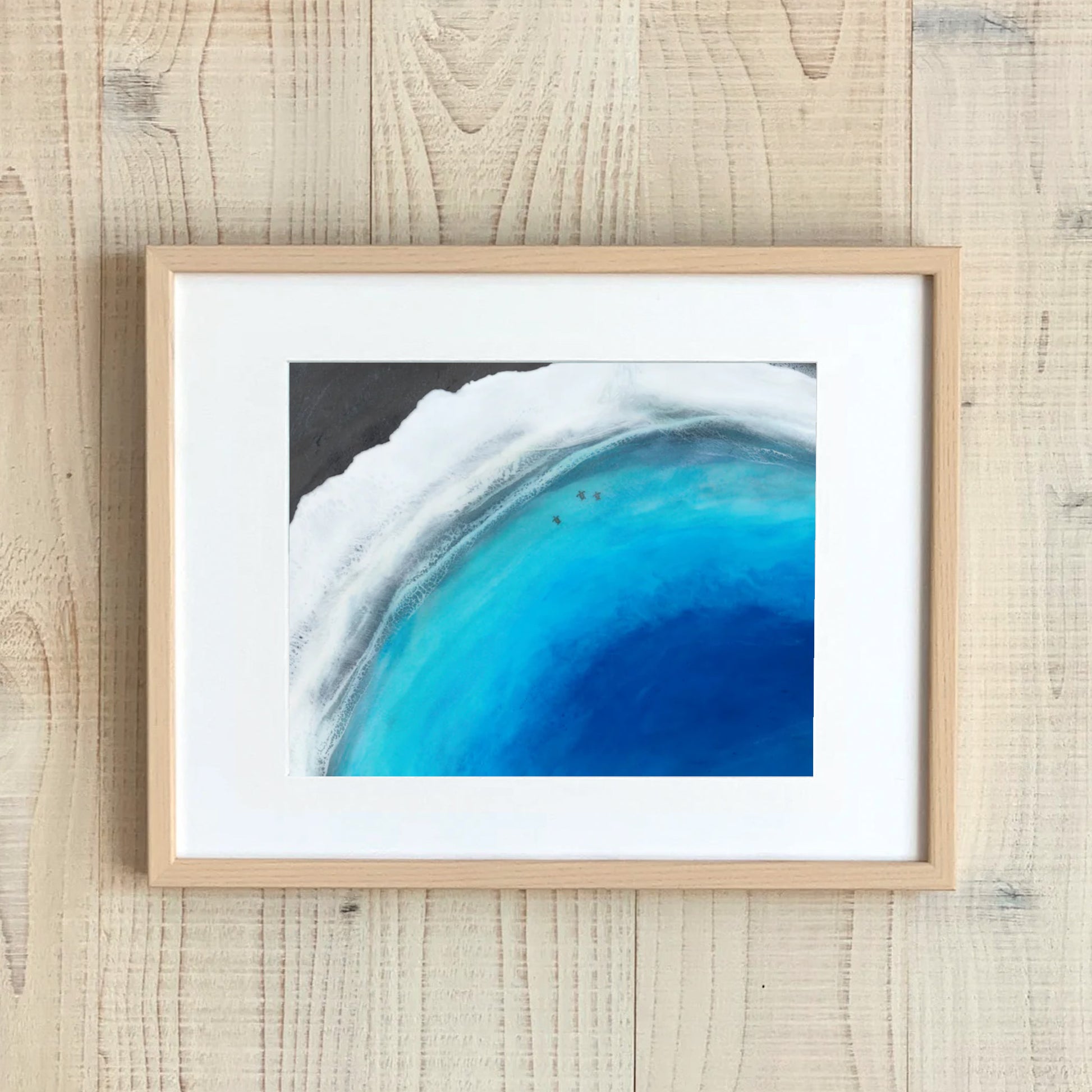 This matted print is reproduction on an original painting created with layered acrylic and resin on wood. Inspired by Hawaii’s beaches, Sarah captured the ocean’s beauty through vibrant colors, flowing movement, and organic forms, building each layer to mirror the sea’s rhythm. She no longer paints with resin after closing her Kaka'ako studio in 2021, making these works a special part of her earlier works.