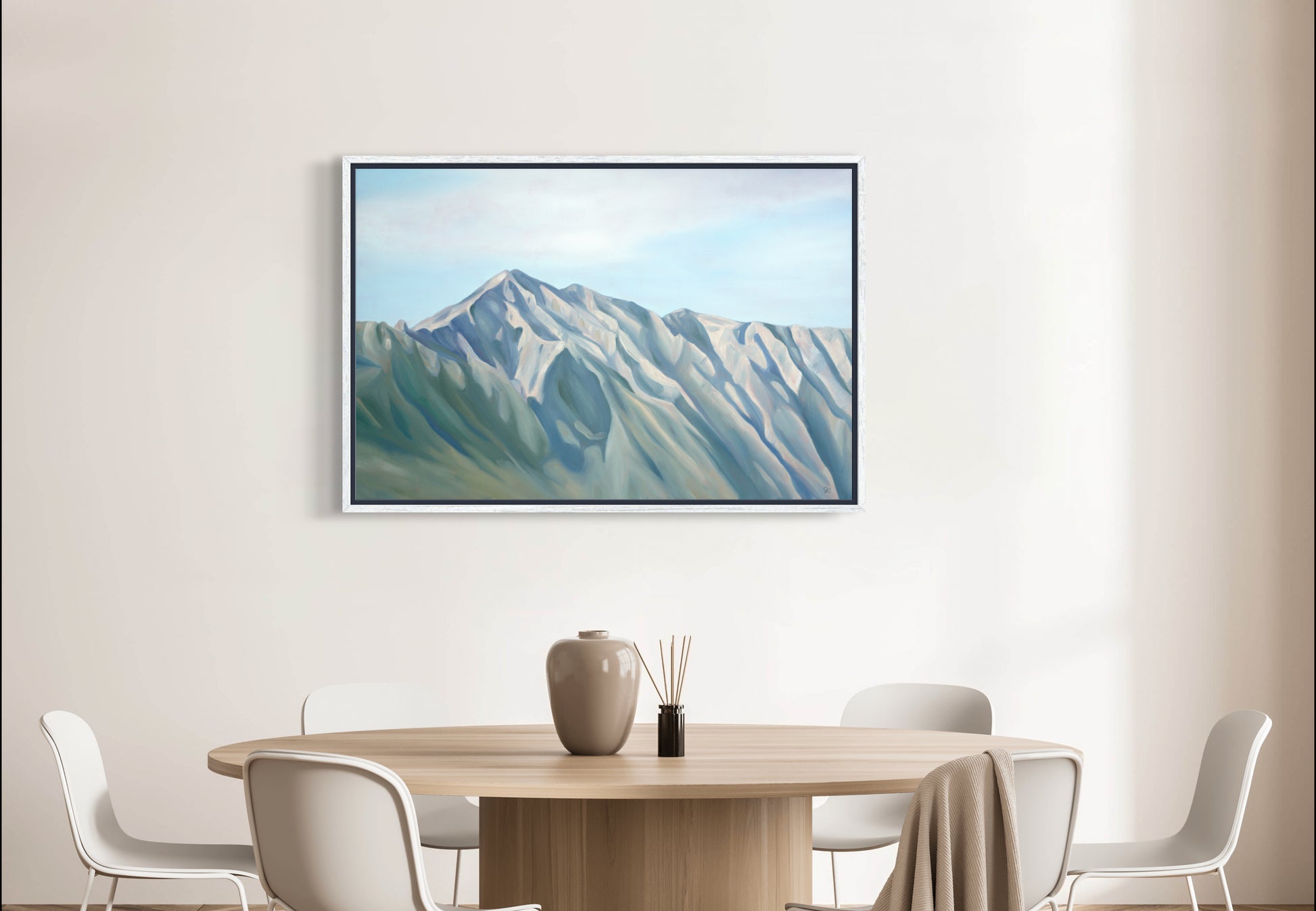 The original painting is oil on canvas. Using sculptural lines and neutral colors, her new work reflects the simple, yet complex beauty of nature, conveys elegance and sophistication, and evokes a sense of peace and wonder.