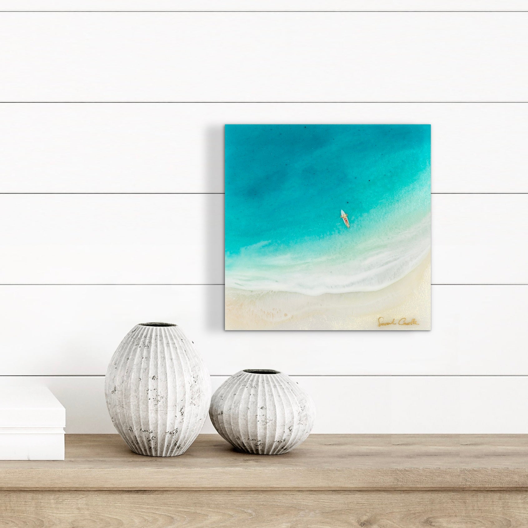 This acrylic print is an open edition reproduction of an original painting created with layered acrylic paint and resin on wood. Inspired by Hawaii’s beaches, Sarah captured the ocean’s beauty through vibrant colors, flowing movement, and organic forms, building each layer to mirror the sea’s rhythm. Since closing her Kakaʻako studio in 2021, she has shifted away from resin, making these pieces a meaningful reminder of her early creative chapter.