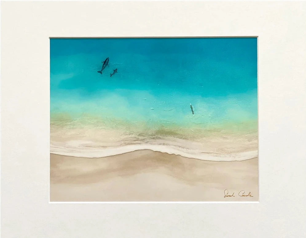 This matted print is reproduction on an original painting created with layered acrylic and resin on wood. Inspired by Hawaii’s beaches, Sarah captured the ocean’s beauty through vibrant colors, flowing movement, and organic forms, building each layer to mirror the sea’s rhythm. She no longer paints with resin after closing her Kaka'ako studio in 2021, making these works a special part of her earlier works.